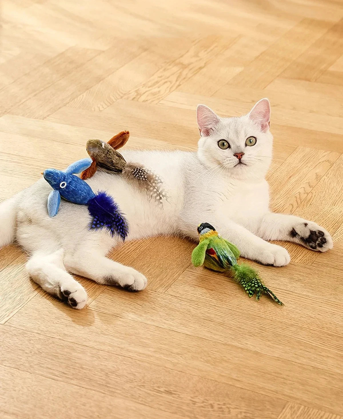 🪶 Soft bird feathers that trigger natural hunting instincts
